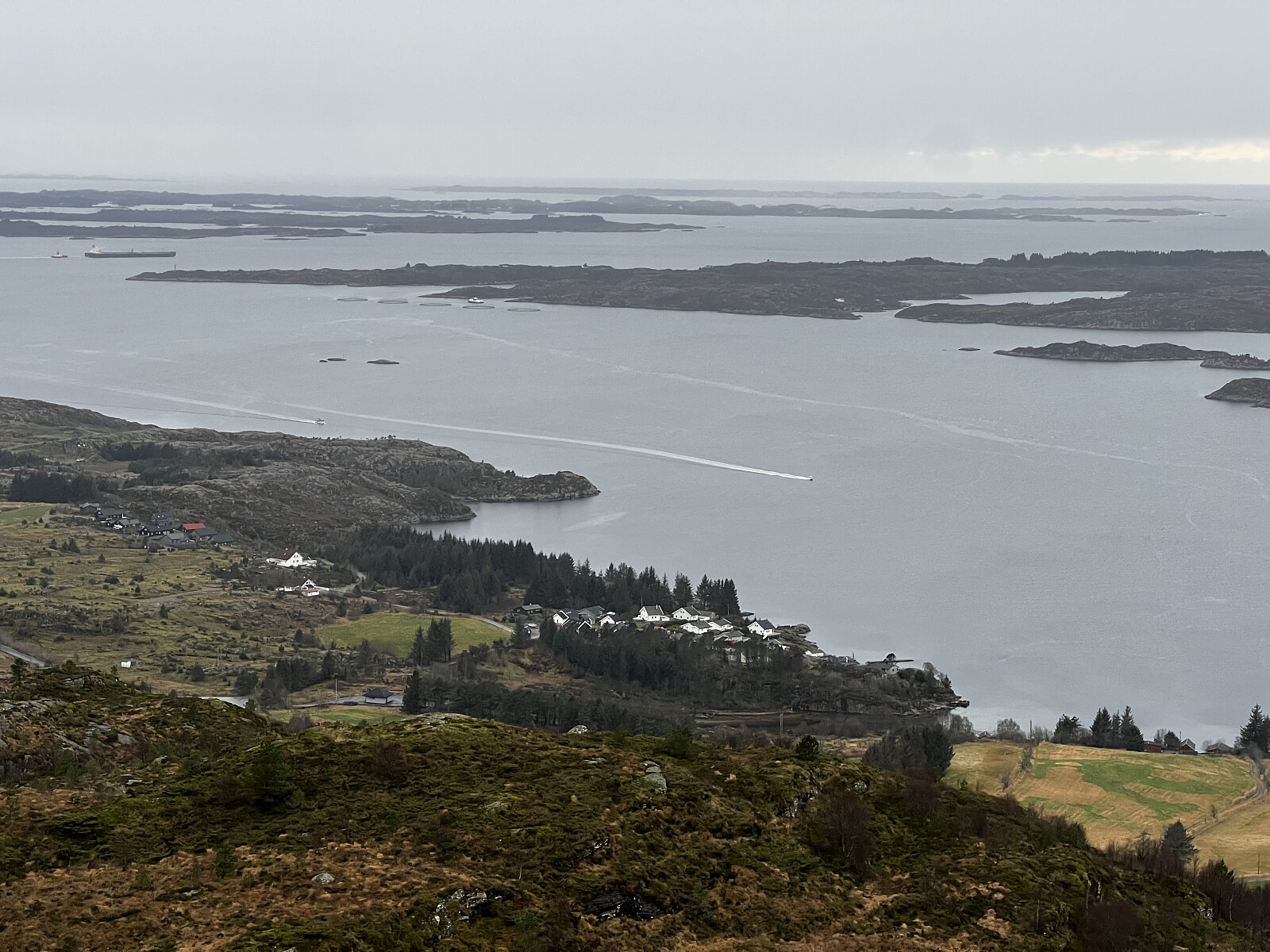 Kjørte over til fastlandet igjen. Nå var det Øksefjellet som skulle til pers. Slet med å finne en egnet plass å parkere, så vi endte med å stille oss i veikanten like ved stistart. Godt merket sti med blå og hvite pinner. Var ganske vått i terrenget her med mye myr, jord og gress. Det regnet også litt nå. Fin og oversiktelig utsikt mot plattformene ved Skipavik fra toppen. Skrev oss inn i boken og fulgte samme rute ned igjen til bilen.