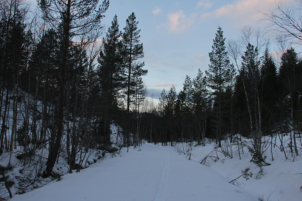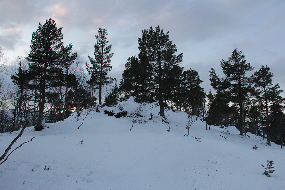 Parkerte ved avkjørselen til skogsvegen. Vegen oppover langs elva var brøyta, og på vegen mot Svartvatnet var det traktorspor godt og vel halvvegs. Med unntak av strekket langs vatnet, der mildvær hadde slått inn og lagd skare, fikk jeg tørr laussnø helt til topps. Gikk en runde over alle toppunkta. Med traktorveg til rett oppunder toppen, og fint føre, blei det en artig retur til bilen.