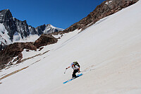 Heiv oss på første tog. Oppe på Jungfraujoch kom vi i prat med et sveitsisk-svensk følge som også var utstyrt med ski. Ellers var skisesongen her så godt som avslutta med hetebølgen som hadde kommet. Fotalpinismen hadde overtatt. Selv om snøen var skitten av saharasand og blei noe seig utover dagen foretrekker vi ski når turen nesten utelukkende går på snø.