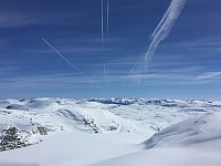 Flott dag, sen start, ca. 15.00. Lite snø i starten så skiene ble på sekken til ca. 1200 moh. Derfra rett til topps på Skauthøe. Hadde gjort dårlig forarbeide og ble skuffet når jeg oppdaget at jeg måtte relativt mye ned. Men, men... ikke mye å gjøre med. Videre til Nordøst for Spiterhøe og selve Spiterhøe, som ligger tett. Derfra atter en gang ned for så å traske opp til Leirhøe Nord (2077 moh). Tungt med randoski og lite krefter gjorde at jeg var glad for å ikke ha Leirhøe som mål. Det så drygt ut oppover dit.