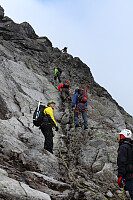 Først 1300 meter på vei, før vi svingte opp bratte skråningen mot breen, ca. 350 høydemeter, inn i tau, myk bre, ikke frosset i natt, stegjern likevel til den bratteste siste delen, før innsteget. 150 nye høydemeter >>>