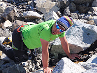 Vel oppe på 2250 så vi at forspranget til damene var blitt 10-20 minutt. Vi bestemte oss for å gjøre Austre Glittertindsoksle nå. På med tau, for det er en bregleppe som må forseres. Men før vi visste ordet av det kom tåka. Vi så kanskje 50 meter, toppen var ikke å se, og vi fikk fullstendig "white out". Heldigvis hadde vi gps, og et minne fra rett før tåka kom. Vi listet oss avgårde, over bredgleppa, utan at vi så eller >>>