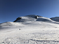 Men, morgenen var som sagt bare fin med sol og rolig start sånn i 6-tiden. Opp slalomløypa, nesten til Kleine Matterhorn,. oppe på ryggen mot Kleine Matterhorn møter vi strømmen av andre som har tatt heisen dit, på 3800 moh. Det er minst 100 stykker å se på vei mot Breithorn og flere på vei. Vi tusler avgårde i rolig tempo. Fartsøkninger merkes momentant. Men det >>>