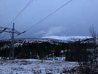 Det er ikke ordentlig vinter ennå, så veien opp mot masta er lettgått. Det er hjulspor i det lille som er av snø, etter hvert som man kommer opp i høyden. Men jeg har med et par truger, sånn i tilfelle, og et par værnebriller. Oppe ved Kalnestjønnin er det is på vannet og 10cm med snø i terrenget. Når strømledningen forlater vegen tar jeg av retning masta, og korter inn svingen som veien gjør. Snøen er hard og det går fint. Oppe ved masta tar vinden godt og det er mer ujevnt med snø. Jeg hopper i trugene og beholder de på helt til jeg er nede på veien igjen. Fra masta >>>
