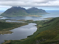 Selv om turen startet i regn og jeg ikke visste hvor det var best å gå for å komme seg opp, ble dette en av de fineste turene i Lofoten denne gang. Spennende å prøve seg opp etter eget godtbefinnende. VAlget falt på første gressrenne, midt i første bildet. Ned valgte jeg den andre renna, den til høyre i bildet. Begge er helt kurante å gå. Under bløte forhold, som nå eller verre, anbefales selvsagt godt fottøy, med litt "bite", ellers kan man gli og "uhæppe" seg. Vel oppe på ryggen er det luftig med fantastisk utsikt mange veier. Også mot Vestfjorden, Stamsund, Breitinden, som jeg nettopp hadde besøkt, og ut til Værøy. Ryggen byr på tre hovedtopper, med ska i mellom. Det er lagt ut noen gamle tau to steder, slik at man lettere kan dra seg opp/senke seg >>>