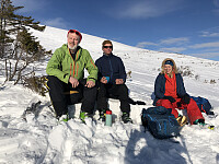 Min compadre har også avtalt å treffe flere, bak min rygg, noe som gjør turen enda bedre og triveligere. Hansi, Richie, Mari og Helgi forenes etterhvert i sporet, oppgått av andre ivrige pudderjegere før oss. Men vi lar oss ikke deppe over andres spor idag, til det er dagen fortsatt alt for fin. Vi trasker avgårde i jevnt sig oppover og oppover, etterhvert med stø kurs mot Fonnfjellet. Fjellet med den eldgamle varden.