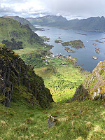 Selv om turen startet i regn og jeg ikke visste hvor det var best å gå for å komme seg opp, ble dette en av de fineste turene i Lofoten denne gang. Spennende å prøve seg opp etter eget godtbefinnende. VAlget falt på første gressrenne, midt i første bildet. Ned valgte jeg den andre renna, den til høyre i bildet. Begge er helt kurante å gå. Under bløte forhold, som nå eller verre, anbefales selvsagt godt fottøy, med litt "bite", ellers kan man gli og "uhæppe" seg.