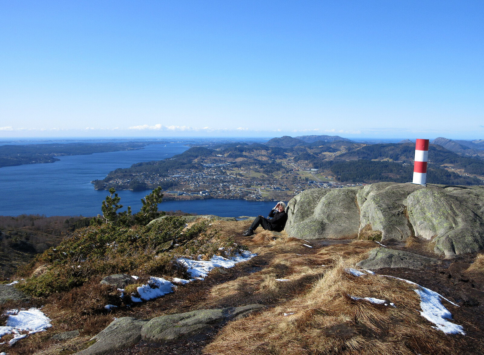 We expected a nice day and wished to make a nice, moderate hike with a chance to catch some sun, also. After first looking at Tveitavarden, Kvamsfjellet, and Vassberget, north of Knarvik, we then found a description of a hike over these hills, but in reverse order, providing additional motivation to explore this part of Alver. After driving there from Bergen, we parked right next to Lindåsvegen, where Årdalen comes down from the northwest. Walking up Årdalen, we then found the trail head for Vassberget, which is nicely marked with a sign. Following this trail, we quickly made it up the ridge in the southwest of Kråkstidalen, but instead of crossing over this valley (as the main trail does), we continued further northwards on the ridge (into the direction of Litlevassberget). At times and with some phantasy, >>>