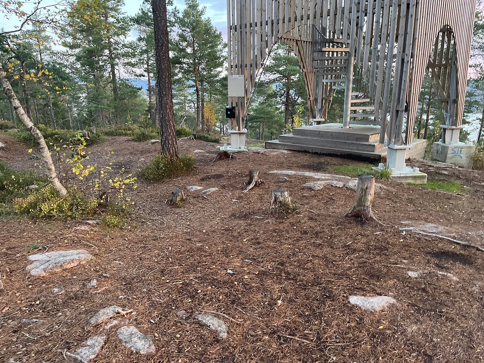 Når det klarnet opp ut over dagen og bra værmelding plukket jeg ut en topp med bra pf. Landet på Fjøsvikfjellet i Ådalen nord for Hønefoss. Tok ca 1.45 t å kjøre dit, og litt nord for Hallingby svingte jeg av til venstre mot Samsjøen som var tydelig skiltet. Etter noen km kom bommen som ble betyalt med mobil via strekkode. Jeg kjørte videre så langt jeg kom, etter en stund på pukket veg. På ca 270 moh var det stengt med kjetting, men plass til et par biler langs vegen. Jeg gikk rolig oppover vegen som svingen seg oppover ganske bratt. Ette hvert ble pukken borte og det var kjerreveg siste biten til stien begynte. Raskt ble stilen bratt og så veldig bratt!! Flere steder var det klyving og et sted var det lagt ut tau (siste bilde) som var veldig greit å spesielt på nedturen. Nydelig >>>
