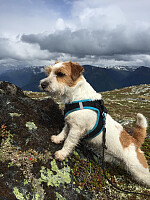Målet var å gå til Keipen for å studere Geitaryggen, da vi lengje har fundert å gå heile ryggen frå Tjugatoten til Keipen. Heldigvis såg det ut til at skodda forsvant på veg oppover, så dette såg bra ut. Det er god sti frå parkeringsplassen og vidare oppover. Vi måtte krysse ei elv, utan bru. Bør nok ta av seg på føtene her. Hoppet mitt med hunden i fanget til ein sleip stein midt i elva var ikkje akkurat "innanfor". Men det gjekk greitt. Vidare oppover var det fortsatt sti, men mykje gjørme og overgrodd. Hunden rota seg godt vekk i nokre bregner på veg oppover den smale stien. Mykje skliing og anna fjas. Vi ralla litt om å gå oppover Bjørnabreen på høgre sida av elva (stien gjekk på venstre sida), men vi var rimeleg glade i ettertid for at vi valde bort det. >>>