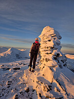 Sesongens første tur ble litt tidligere heldigvis enn sesongen før, da det ble påske til slutt før skia var på føttene. Var litt andre folk som hadde tenkt å ta turen i området også, men først ble det ca 30 min å vente nede i veien pga en bil som hadde havnet i grøfta. Overraskende greit føre oppover, og fint oppe på toppen i vakkert desember lys. Grei snø ned også, om man oppsøkte de rette stedene :)