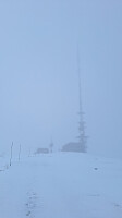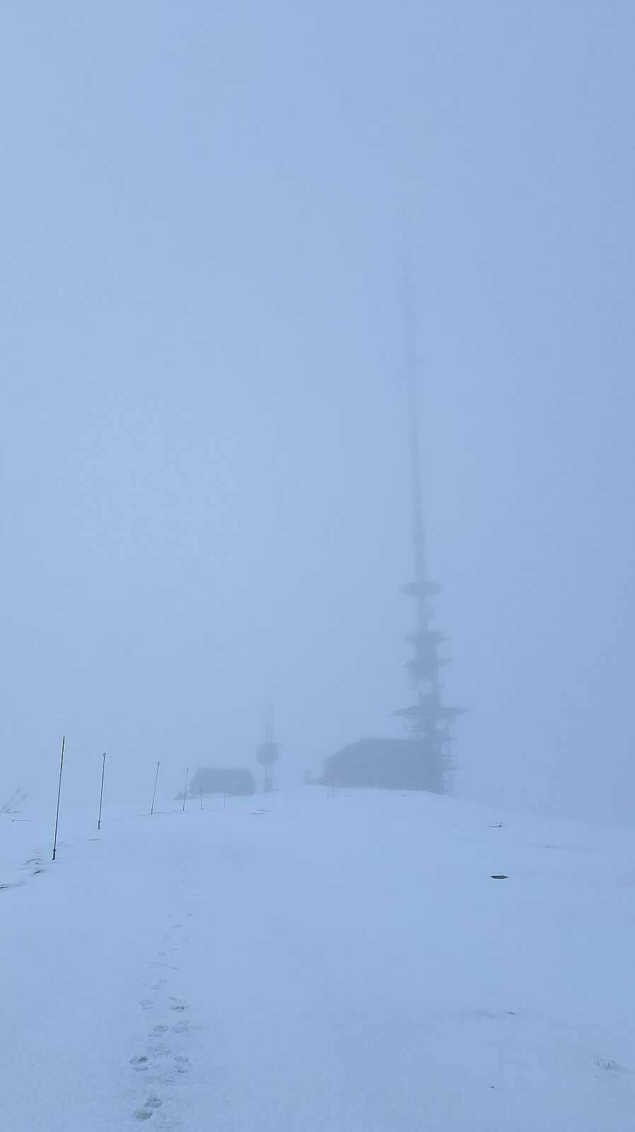 Tåke fra morgenen av og litt yr i høyden. Slapp å orientere med vei helt opp. Nedenfor toppen trodde jeg det var folk der oppe, men det viste seg å være is og snø som ramlet ned fra mastene og smalt i stålet.