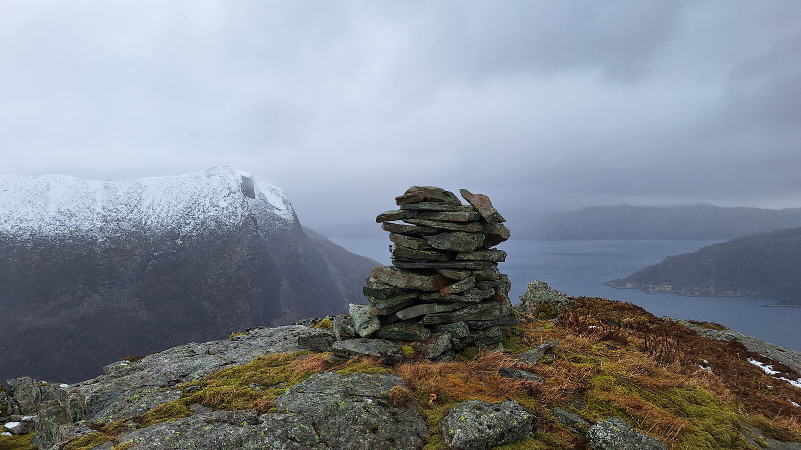 Denne turen frister ikke til gjentagelse, iallfall ikke under dagens forhold. Riktiginok veldig fint opp gjennom furuskogen med plenty med hjortestier, men fra ca. 350 moh. begynte sleip snø, og jo høyere opp, jo verre, siden snømengden økte. Det var vanskelig å plassere føttene riktig og potensielt mange muligheter for å knerte føttene. Snøen skjulte glatte og løse steiner og lyng med luft under. Hustrig på toppen i regn og vind, men flott utsikt selv på en grå ettermiddag. Brukte god tid nedover det forræderske snøpartiet og datt bare en gang uten å slå meg.