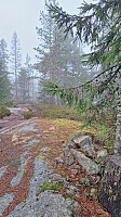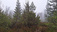 Det sluttet å regne da jeg parkerte, men det ble definitivt ingen tørr tur. Det dryppet ustanselig fra trærne, og de stod tett mesteparten av ruta. To plussgrader ved start. I høyden frøs regnet på greinene, og jeg ble pepret med isbiter. Aldri opplevd noe lignende før. Ble ikke noe mindre våt av det. Tåka lå hele veien.