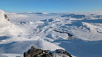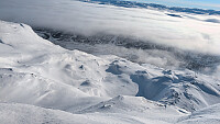 Litt mere snø nå, men fortsatt muligheter for nye riper med stein rett under overflaten. Var ferske spor opp til ryggen. Løssnø og god trening til topps derfra.
