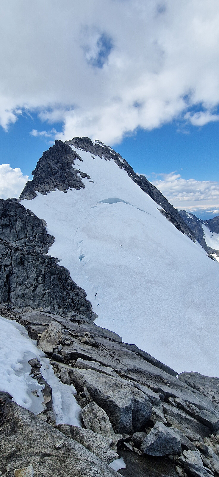 Litt kjei form. Vart ein del små stopp. To karar før meg heile vegen, eine av dei gjekk opp på Vestre Tverrbottind 2113, men det kravde ein del meir av ein, då det var noko meir eksponert og i halvdjup snø. Ikkje umogleg, men eg hadde for lite futt i kroppen til å orke, so det vart med fortoppen i dag. Eg gjekk igjennom med den eine foten i ein bresprekk mellom Leirløyfte og Søre Ilåbreen som var dekt med eit tunt snølag. Ein tankevekker. Her er det fleire som har sett seg fast. Ein trønder sette seg fast her for ikkje så lenge sidan, og vart redda av sekken som hang att. For endå fleire år sidan var det ein kar som hamna mykje lenger ned, og berre fekk redda seg då han så vidt rakk å sende koordinatane til naudetatane før telefonen døde. Nedkøyringa frå leirløyfte var >>>