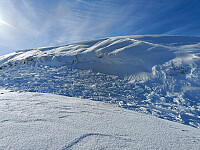 Det gikk bra i motbakkene, og så kom det glimt av sol, som satte mer motivasjon i meg. Men over tregrensa var nattens regn kommet som nysnø, og med plussgrader og glimt av sol, kom også de første tegnene på lugging i skisporet. Fikk et fint glimt av toppen over >>>