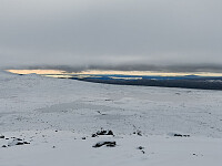Da jeg kjørte oppover på morgenen, og kom til Båtskardet, trodde jeg det ble bomtur med tanke på ski i dag, men et par kilometer før høyeste punkt på Flya, ble det ganske brått langt bedre snøforhold. Tok de gamle skiene, men kom faktisk ikke borti stein i det hele tatt i dag. Faste fine forhold, men ikke isete. Det var rundt 10 minus, men jeg hadde kledd meg godt for dette, og trengte ikke gå med vindjakka en gang. Det eneste jeg hadde ønsket meg, var at sola skulle drive tåkeskyene vekk, slik jeg så at den hadde gjort flere steder i nærheten. Dette ønsket ble ikke oppfylt, og derfor ble heller ikke skituren lenger i dag. (Hadde egentlig tenkt på Østre Fagerdalshø, men der var det for lite snø. Også Brurskardknappene hadde for lite snø.)