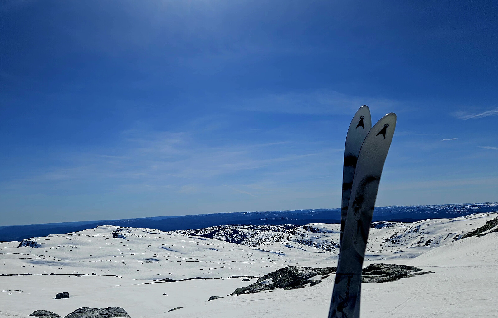 Dag med sol fra blå himmel, 12 grader og bra med snø. Litt vind i høyden var bare deilig for nedkjøling. Bare 100 meter å bære ski, helt nede ved parkeringa. Det ble en drømmedag i fjellet med noen gode pauser i le. :)