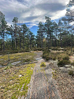 Planla dagen slik at jeg skulle legge bak meg det jeg oppfattet som den kjedeligste kommunetoppen så fort som mulig. Dette var også dessverre den lengste... Hadde sykkel bak i bilen, så besluttet å gå for den lengste ruten, men hvor 1/3 kunne gjøres unna på sykkel. Her var det kjerrevei som bare ble mer og mer gjengrodd av det lange karakteristiske gresset som preger hele Sørlandet. Umulig å se om det var store dumper og hull underveis, måtte bare gøtse på. Veien endte ved et vann og et naust. Herfra var det ikke annet enn å gi på opp knausen og inn i skogen. Visste at man her måtte bushe et betydelig stykke tvers over for å møte stien som man kunne følge til toppen. Det jeg ikke visste >>>
