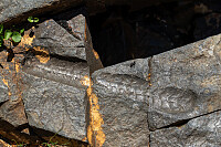 Relativt lite vann i bekken så kunne bevege meg nedover på svaberga mot fossen. Kom ut mot stupet og så her at det nesten var en naturlig trapp i østsida av fossen. Så bevegde med nedover og endte ute på ei “øy”. Kom meg ikke helt ned da de siste høydemeterne gikk over i stup. Fra “øya” var det noe bedre utsikt mot hovedfossen, som “lider” litt >>>