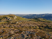 Kveldsturen i dag startet i hyttefeltet ved Haukelifjell Skisenter. Jeg fulgte en sti oppover lia. Det var varmt og godt selv om klokka var over åtte om kvelden. På grunn av det varme og tørre været som har vært, var det knusktørt overalt i terrenget. Jeg fulgte en fin sti oppover vestsida av Råsanuten . Fra toppen var det storslagen utsikt, spesielt mot øst. Videre mellom de to Tvitjønnane bort til Vågslinuten . Nydelig utsikt her også. Jeg var nå på toppen av skiheisen, så jeg fulgte heistraseen et lite stykke nedover før jeg dro sørvestover mot Arbunosi . Deretter tok jeg sikte på en grusvei som går på siden av alpinbakken. Den siste delen ned til bunnen av dalen var det veldig varierende underlag, men det gikk greit. Til slutt ble det noen ekstra høydemeter tilbake til >>>