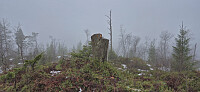 After following the marked trail via Nordre Gamletjørnhaugen , I left it shortly after Lillianbrekko and headed off-trail via various deer tracks to the summits of Hovåsen Sør and Hovåsen. At Hovåsen Sør there was a trig bolt and a view down to Kismul Skyte- og friluftssenter (closed on Sundays, except for special events, according to their web page). There may also be ok views from Hovåsen but these were all hidden by the fog.