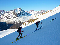 Tempoet var rimelig effektivt og vi kom oss fort opp til platået der vi måtte vurdere om vi ville gå opp ryggen eller inn i gryta og opp flanken. Det ville bli skibæring et lite stykke på ryggen mens gryteruta så noe mer lovende ut selv om det var brattere og kanskje litt glatt underlag.