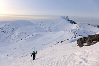 På hjemturen fra Senja benyttet jeg muligheten for å gå en liten spasertur til Knuten før jeg fortsatte ferden østover og gikk en formiddagstur til Keipen. Gikk opp fra startstedet som brukes om sommeren (ved Mefjordvatn) og gikk opp på høyre siden av elva og fulgte en dalformasjon oppover. Jeg trodde at all snøen ville vært blåst bort etter mye vind dagen før og da det var meldt liten kuling i dag også. Men jeg ble overrasket over at det var faktisk vindstille og pudderføre. Pudder på skare men likevel, bedre enn bare hard skare. Underlaget var heldigvis ikke så hardt lenger opp i sørøstflanken, så puddersnøen hadde bundet seg relativt bra i topphenget og jeg gledet meg til nedkjøringa. Oppe på eggen var det så hardt at jeg byttet til stegjern men det var verdt å gå >>>