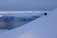 Nok en førjobbtur, denne gangen til Storsteinnestinden da jeg trodde det skulle bli like fint skiføre her som på Skitntinden mtp ganske lik eksposisjon. Dessverre var det ikke helt sånn som forventet og variert mellom fin løssnø, litt mer vindpåvirket snø og isskare helt øverst i topphenget. Skiene ble stående der man følger ryggen opp til toppen. Heldigvis fikk jeg den fine utsikten som en trøst :)