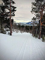 Nydelige forhold i Morken og Nystugubergrunden. Stort sett under tåken som lå på Bjorli i dag. Ca fem kuldegrader, godt blå-extra føre, god glid og godt feste.