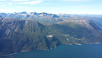 Parkerte ved parkering nord for Hydro. Her starter sti til Flaggnuten og Hovsnebba. Den snor seg bratt opp i starten, og kjetting tau er lagt ut tre plasser. Unngår alltid å bruke disse, om mulig :-) Liten avstikker ut til Flaggnuten, med fin utsikt over Sunndalsøra.