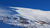 Solen glimret med sitt fravær denne dagen, men ellers ble det en flott tur til et av de virkelig fine ski-fjellene i nærområdet (men vær obs på dette fjellet mht rasfare). Strålende nedkjøring!