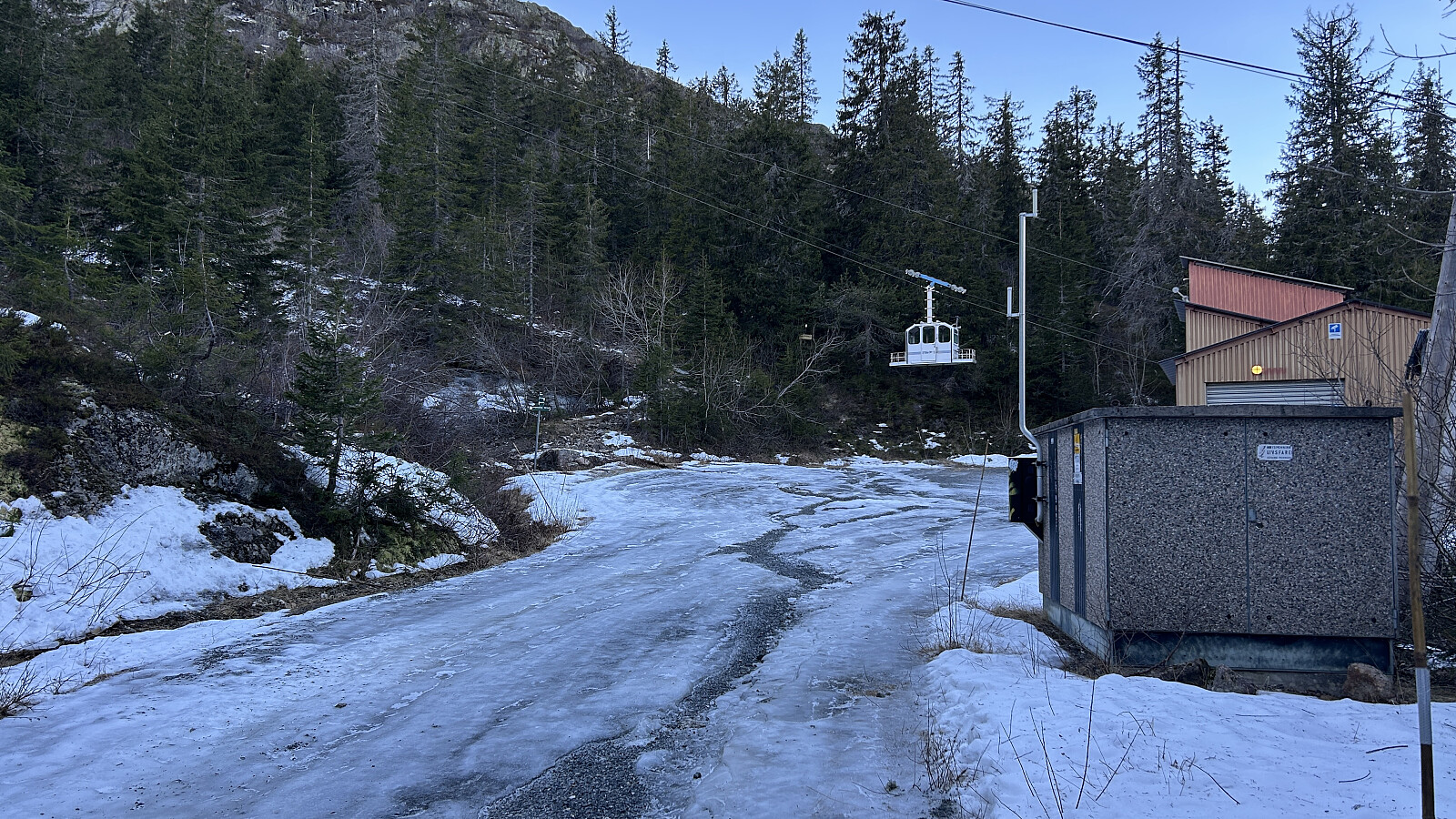 Frost i bakken, gråvær og temperatur omkring null. Stort sett barmark, men veldig isete på grusveien til Slondalsvatnet. Snø over 900-1000 moh.