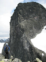 Oppe på Lauvnostinden kl 1115. Ryggen utover mot Nørdre Soleibotntinden smalner raskt av, og her var det på med klatreutstyr.