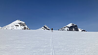 Krysset oppover i NØ-retning til 1300 moh før jeg dreide mot SSØ og rundet mot toppområdet fra sørsiden. De siste 2-300m var det hardt, isete og skavlete så her gikk jeg til fots. Nesten nedsnødd varde på GPS 6734165 396115 omtrent som på PB. Primærfaktor på 65 m mot skaret i sør stemmer også bra.