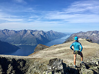 Tror dagens trim var en av bestenoteringene. Allikevel er det av og til lite forskjell på tidene om jeg småløper så og si hele veien kontra å gå fort med noe lengre steg innimellom. Sleipt og vått er det ofte og egentlig lite å hente for meg iallfall. Tok meg uansett noen minutt til å ta bilder på toppen og på vei ned igjen. Vakker dag, shorts og singlet, sol og blikkstille på fjorden - aaaaah !!!