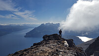 Besøk til Kjerringøy og Eidetinden. En skoddedott hang på toppen da vi startet å gå som lettet mens vi gikk oppover. Ivrig ble med til 470, der fant vi en plass med et lite vannsig. Han var relativt fornøyd der vi forlot han, med sol og bra utsikt. Fortsatte vestryggen til topps, merket sti hele veien. Flott utsikt så vi satt lenge og koste oss i solskinnet før vi tok returen ned samme vei.