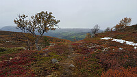 Fin høsttur opp på Storbekkhøa, gikk rett nordover fra parkeringen og fulgte stien gjennom bjørkelia til høyre for Veslebekken. Like før vi kom til skogbandet gikk vi mot vest og krysset over Storbekken videre fulgte vi stien oppover etter ryggen til topps. Sur kald vind på toppen.