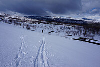 Innover dalen var det utrolig kvitt og fint, masse snø. Fulgte ryggen over det store Tausafjellvatnet mot toppen. Skydott på toppen og litt vind, så vi tok matpausen i søkket rett før 1400 meter. Da vi fortsatte letnet det helt, og vi fikk full utsikt fra Bjørntoppen. Så langt inn i Sverige og til Suliskongen og ikke minst en topp som jeg gjerne skulle vært på Nordre Saulo…. Full vinter her i nord enda så skiføret vill nok holde seg en stund til. Etter en lang pause her oppe tok >>>