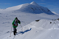 Etter frokost på Limmingen Gjestegård kjørte vi mot riksgrensen. Tok sjansen og parkerte i veikanten ved Raentserenjohke. Det var godt skiføre på sommerveien retning Sundtangen. Forlot scooter-sporet og la kursen over Renselvatnet. Fortsatte til Rurukvatnet som ligger innenfor nasjonalparken. Krysset på nytt isen før vi tok fatt på oppgangen til Nursfjellet (1184). Flott utsikt mot Kvigtind, Jetnamsklumpen og Børgefjell. Vi var også innom Nurshaugen (1080) og Raajnese (965). Praktfull nedkjøring til Renselvatnet og scooterløypa. Avsluttet med årets første utepils i solveggen på gjestegården.