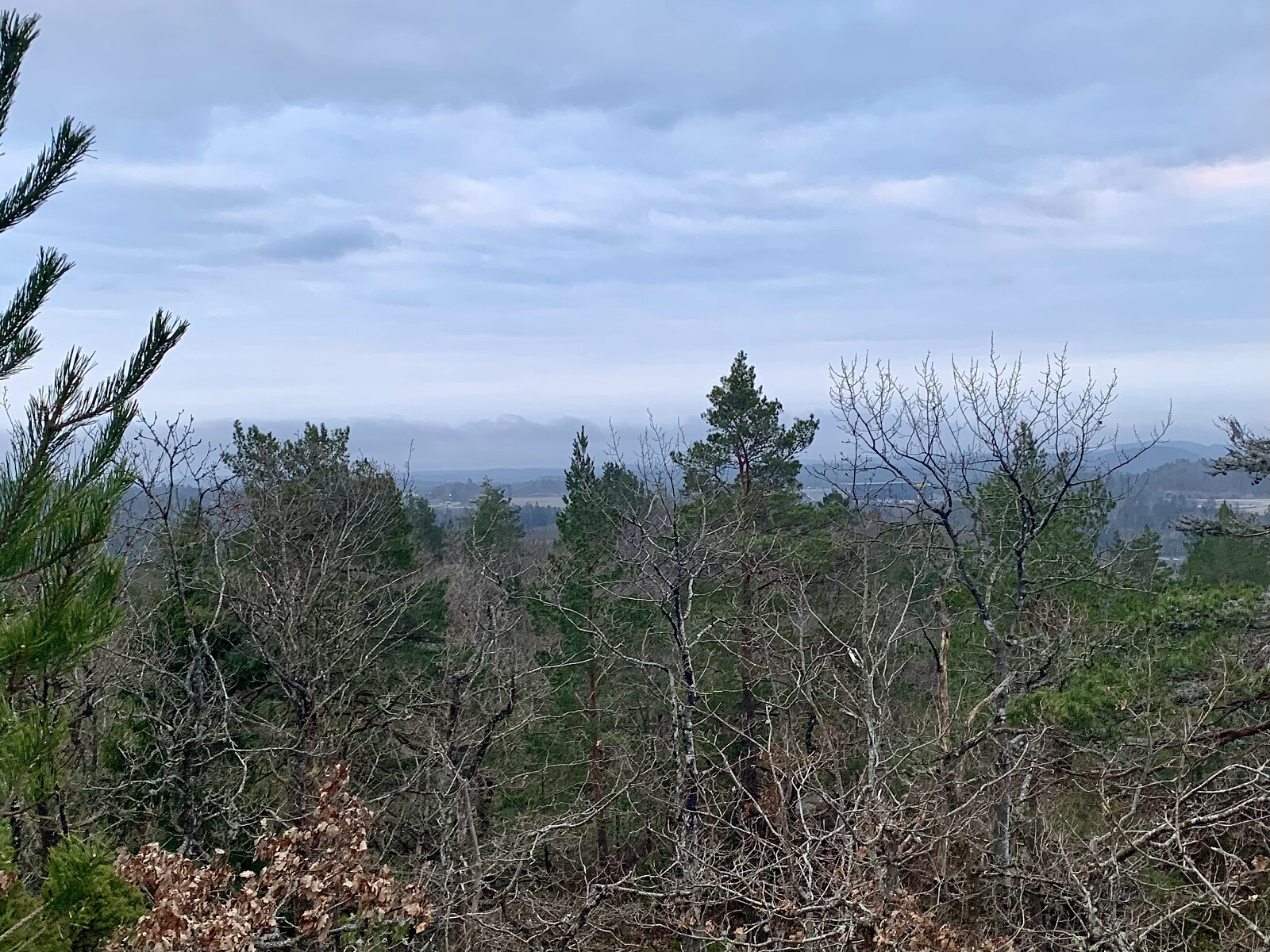 Tur fra bommen på Øya. Vi gikk bomveien til vi kom til veiens høyeste punkt. Derfra går det en sti som ender sør for toppen. Siste del av turen gikk vi bratt opp mot den solide knausen som danner toppen. Litt utsikt og rester etter trig-punkt. Det var noe mer utsikt nordøst for toppen.