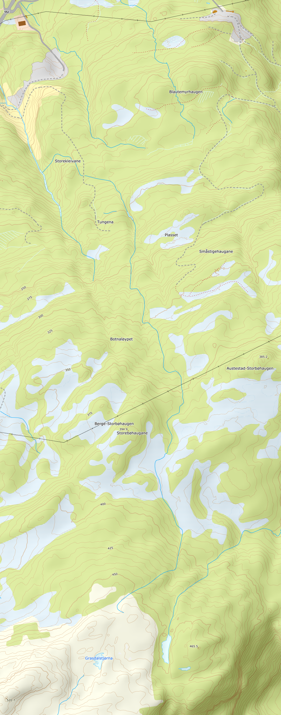 Halve turen går på skogsvei, resten av turen skulle foregå på merket sti, men den merkingen så ikke jeg noe til. Turen opp gikk mest etter egen navigering, der jeg var innom svak sti i perioder. Ellers var det mye hjorttråkk i terrenget. Toppen var uten skog med fin utsikt. Ned igjen tror jeg at jeg klarte jeg å følge sti trassen sånn noenlunde. Grei tur men litt krevende navigering gjennom skogen. Så ikke toppen før jeg var nesten oppe.