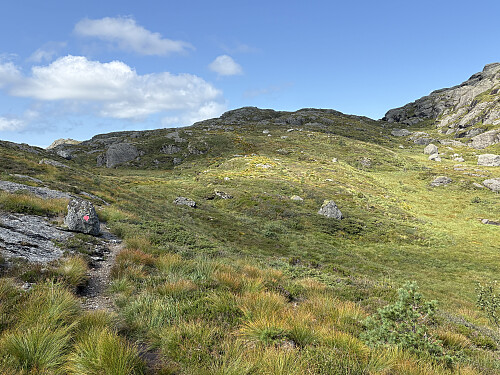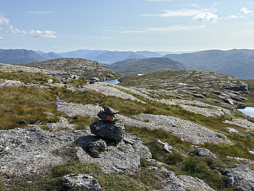 På tur tilbake tok jeg en avstikker oppom Bukkanibba. Denne er også skiltet og merket fra veien, selv om stien ikke tilsynelatende var like mye brukt. Enkelte myrpartier gjorde turen litt mer utfordrende med lett fottøy, men belønningen på toppen gjorde myrene til en bagatell. Flott utsikt med flere idylliske småtjern her og der.