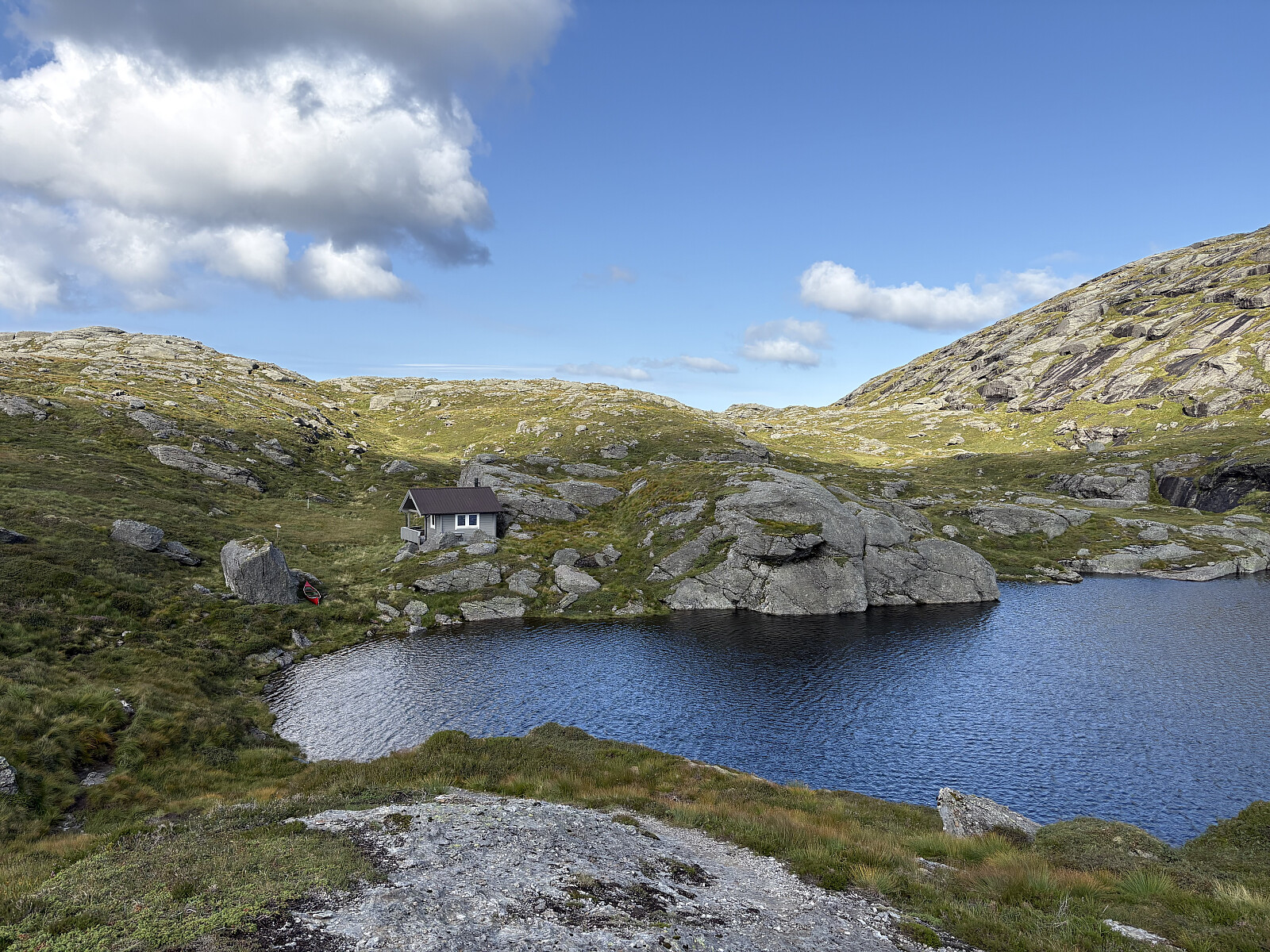 Jeg kjørte opp fra Ølen og parkerte ved gården Dueland. Her var det laget til en fin plass å parkere på:) Jeg gikk videre oppover veien som var tilrettelagt som turvei og kom etter hvert frem til en flott dagsturhytte som lå flott til ved et veidele. Jeg tok en kort titt innom her før jeg fortsatte omtrent 500 meter videre mot nordvest før jeg tok til høyre opp mot Gråhorga. Litt oppe i lia tok jeg til høyre igjen på merket sti som førte meg helt til topps. Der ble jeg møtt av en diger varde og en enorm utsikt over fjordene i nord, fantastisk! Etter en fin stund på toppen fortsatte jeg videre ned på nordsiden etter tips fra et par jeg møtte underveis. Dermed ble det en rundtur via en annen flott turhytte før jeg etter hvert endte opp tilbake på stien som jeg hadde startet på.