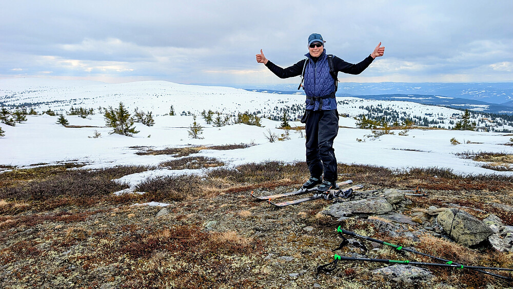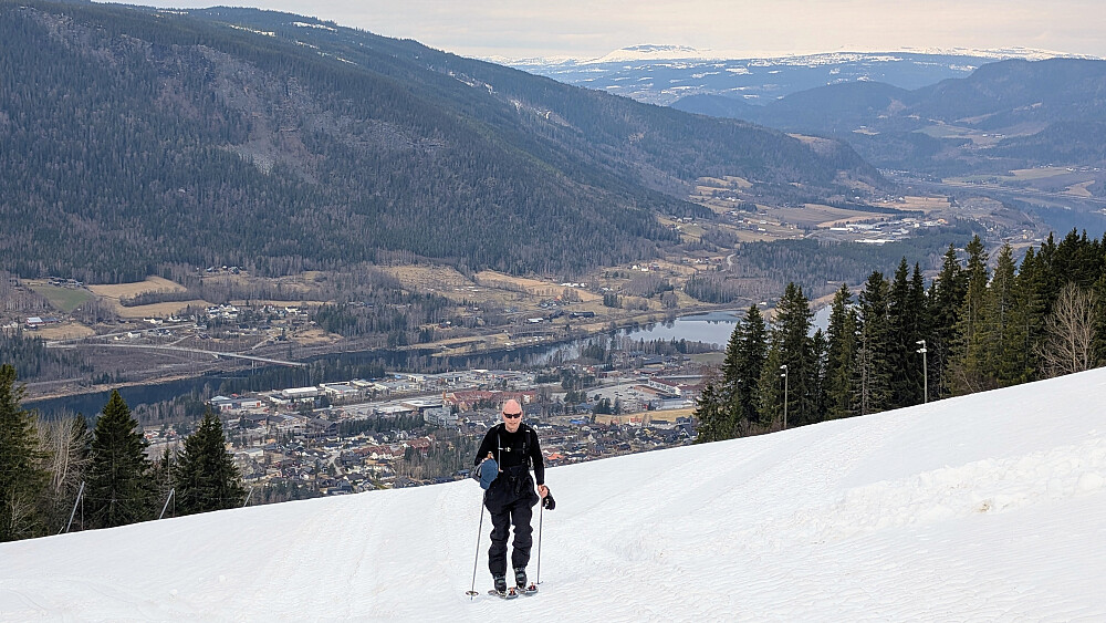 Ikke mang i bakken i dag for å si det slik. Ingen faktisk. Hadde hele bakken for oss selv. Svettet og brillene dogget oppover. Det er noen heftige bratte heng der, men gode forhold. De kunne fint ha holdt bakken oppe førstkommende helg...Vi brukte 2 timer til toppvarden. Litt kjølig trekk på toppen, men man er jo på nesten 1100 moh. Ca 900hm var ei bra økt på ca 3km. Litt mat ved den øverste heisstasjonen før vi satte utfor bakken. I traseen VI valgte ned var det ikke så gode forhold som i traseen oppover. Det var kjørt litt røft med skuter/maskin og det var litt røft underlag, men også stedvis fine forhold. Vi kom velberget ned...begge vi pensjonistene.
