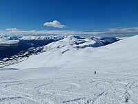 Etter turen til Heimdalshøye fortsatte ferden mot Sunnmøre. Det ble overnatting på parkeringsplassen/utsiktspunktet på Ljøen, med lovende prognoser for været neste dag. Turen startet med bæring av ski de første 100 høydemeterne av den Trondhjemske Postvegen. Herfra var det nok snø til å spenne på seg, og vi forstatte opp til Ljøsætra der vi tok en liten rastepause. Videre gikk turen oppover gode spor, det er tydelig at dette er en populær tur - med rette. Vel fremme på nordtoppen satt vi fra oss skiene og gikk til fots resten av veien til toppen. Her var det sur vind, en voldsom kontrast til den vindstille Ljødalen. Kort toppvisitt før vi returnerte til skiene og begynte på nedfarten. Det begynte å bli sent på dag, så den solvarme fjellsiden i Ljødalen hadde fått et ekkelt >>>