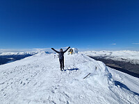 Vel fremme på nordtoppen satt vi fra oss skiene og gikk til fots resten av veien til toppen. Her var det sur vind, en voldsom kontrast til den vindstille Ljødalen. Kort toppvisitt før vi returnerte til skiene og begynte på nedfarten. Det begynte å bli sent på dag, så den solvarme fjellsiden i Ljødalen hadde fått et ekkelt >>>
