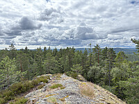Jeg gikk først 500 meter innover langs veien og tok så til høyre inn på den gjengrodde traktorveien som er avmerket på kartet. Stien/veien var grei å følge helt til jeg var 200 meter SV for toppen. Herfra ble det lyngvandring frem til toppunktet som var markert med en liten steinvarde. Fint skogsterreng og noe begrenset utsikt vestover. Samme vei tilbake.
