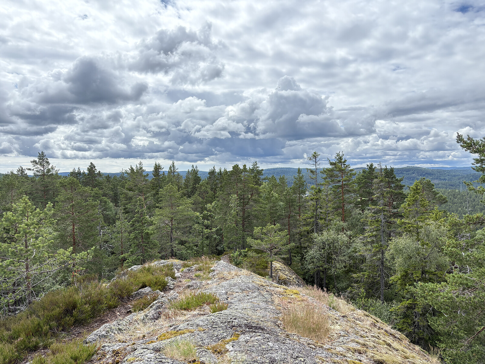 Jeg hadde parkert på den store p-lomma langs Drangedalsveien NV for Våsjøvannet, og må innrømme at jeg knotet litt for å komme over bekken nede i skaret. Her var det løst og bratt underlag, nedfalne trær, tett kratt og sleipe steiner. Heldigvis ble det noe bedre på turen opp på andre siden, selv om det også her var bratt og en del kratt. Det gikk likevel relativt fort oppover lia og etter et kvarters tid var jeg oppe på åsryggen. Herfra gikk turen i høy lyng frem til toppkollen. Ingen utsikt eller markering av toppunktet, >>>